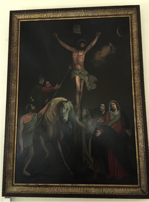 Bemerkenswert ist ein Gemälde, dass die Kreuzigungsszene vor dunklem Hintergrund darstellt. Maria Magdalena umfasst den Kreuzesstamm, daneben stehen Maria und Johannes. Auf der anderen Seite bestimmt der römische Hauptmann, auf einem Schimmel reitend, die Szenerie und davor zielt Longinus mit einer Lanze auf den Gekreuzigten.